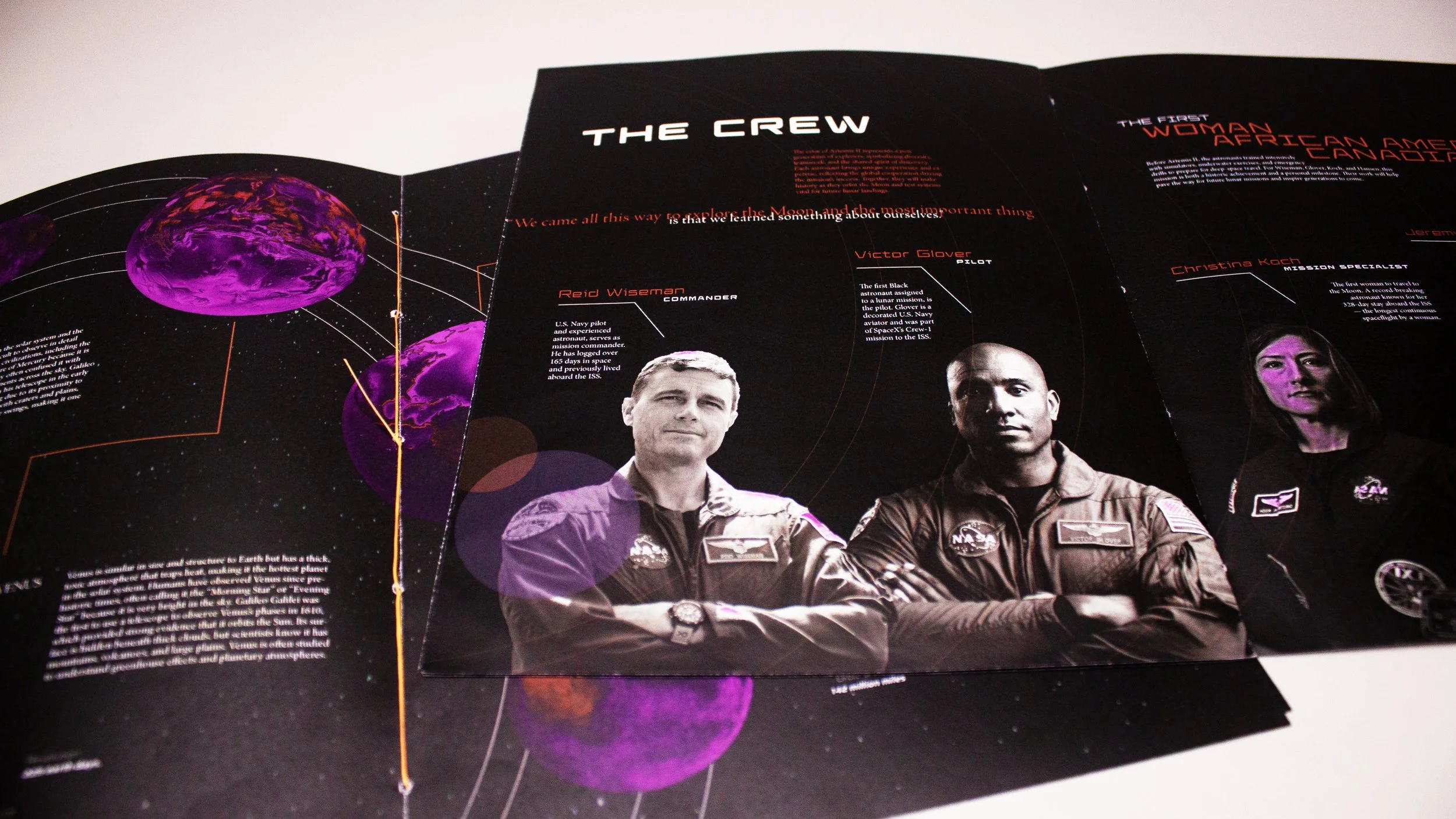 This series of three field guides explores space through both content and structure, using distinct grid systems to reinforce each topic. The first guide follows a manuscript grid, presenting a clear, continuous narrative of space history, from early discoveries to present-day advancements. The second adopts a column grid to organize information about the solar system, highlighting ten key elements: the eight planets, the sun, and the moon. The final guide shifts to a deconstructed grid, reflecting the forward-looking and complex nature of the Artemis Program, including details on the launch, crew members, their roles, and its broader implications for the future of space travel.